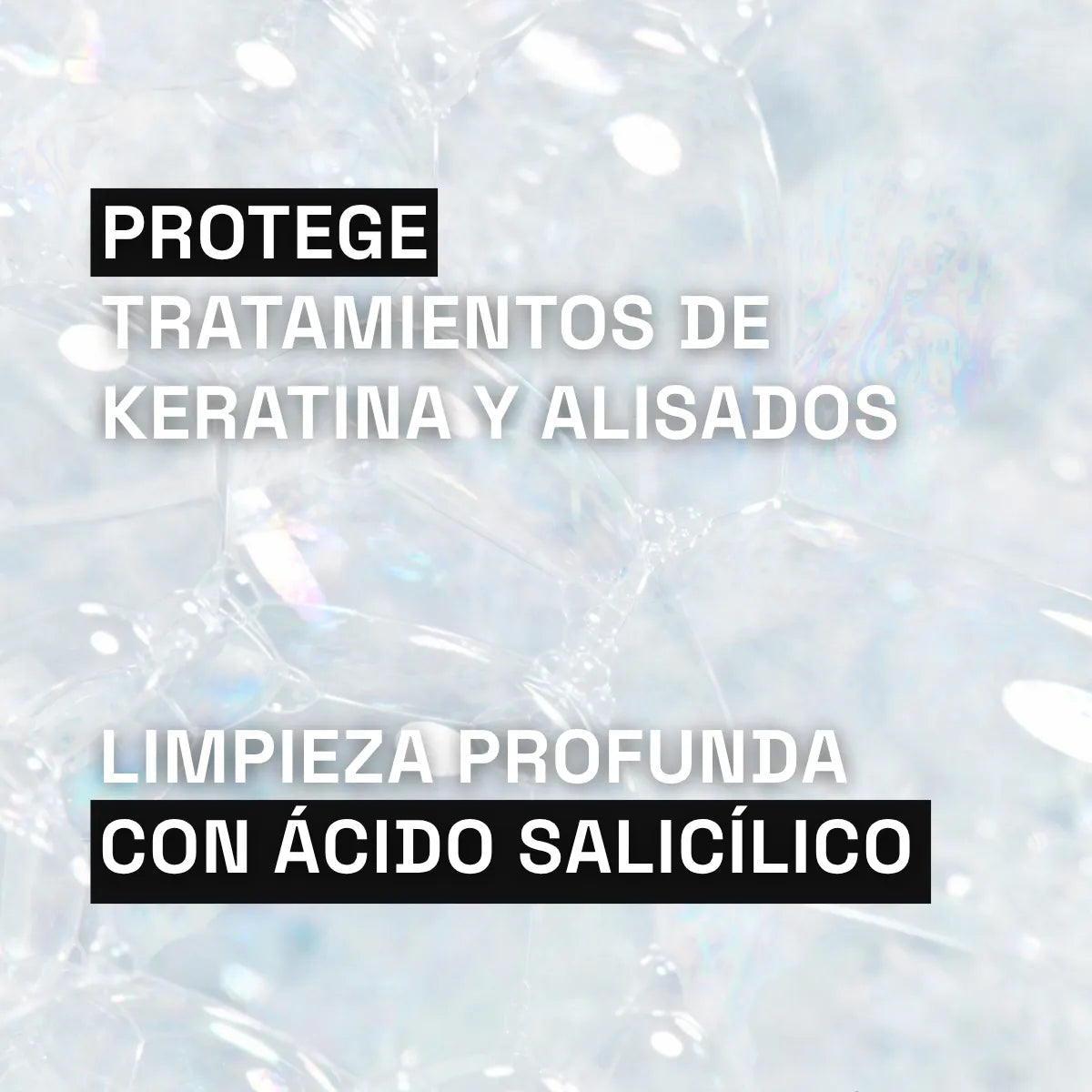 Libre de sal, sulfatos, siliconas y parabenos. Contiene ácido salicílico, carbón activado, menta y un fresco toque de manzana verde para limpiar sin irritar y dejar el cabello con una sensación revitalizante.